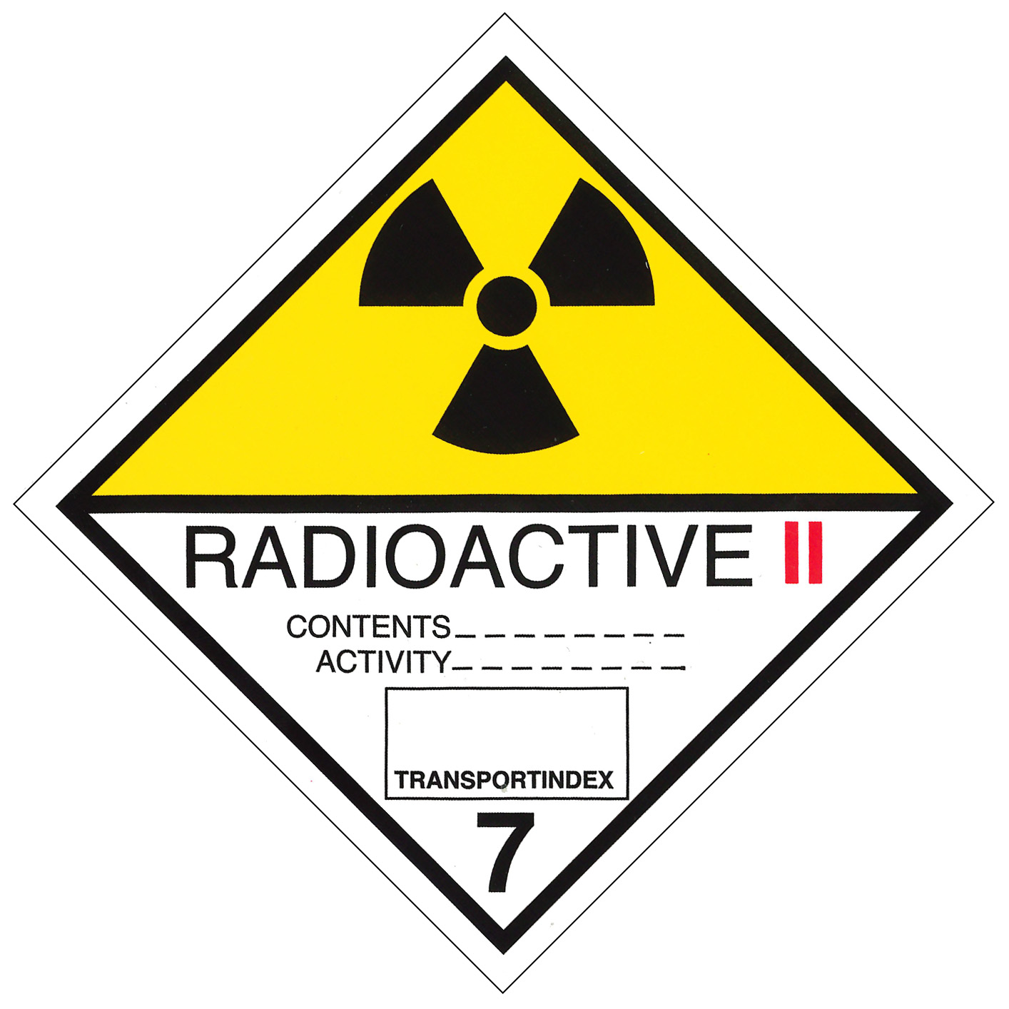 Der Gefahrgutaufkleber für radioaktive Stoffe kennzeichnet Materialien, die bei unsachgemäßer Verpackung eine Gefahr durch Aufnahme radioaktiver Partikel oder äußere Bestrahlung darstellen können. Das Gefahrgutetikett Klasse 7 Kategorie II (gelb) steht für radioaktive Stoffe mit mäßiger Strahlungsintensität.