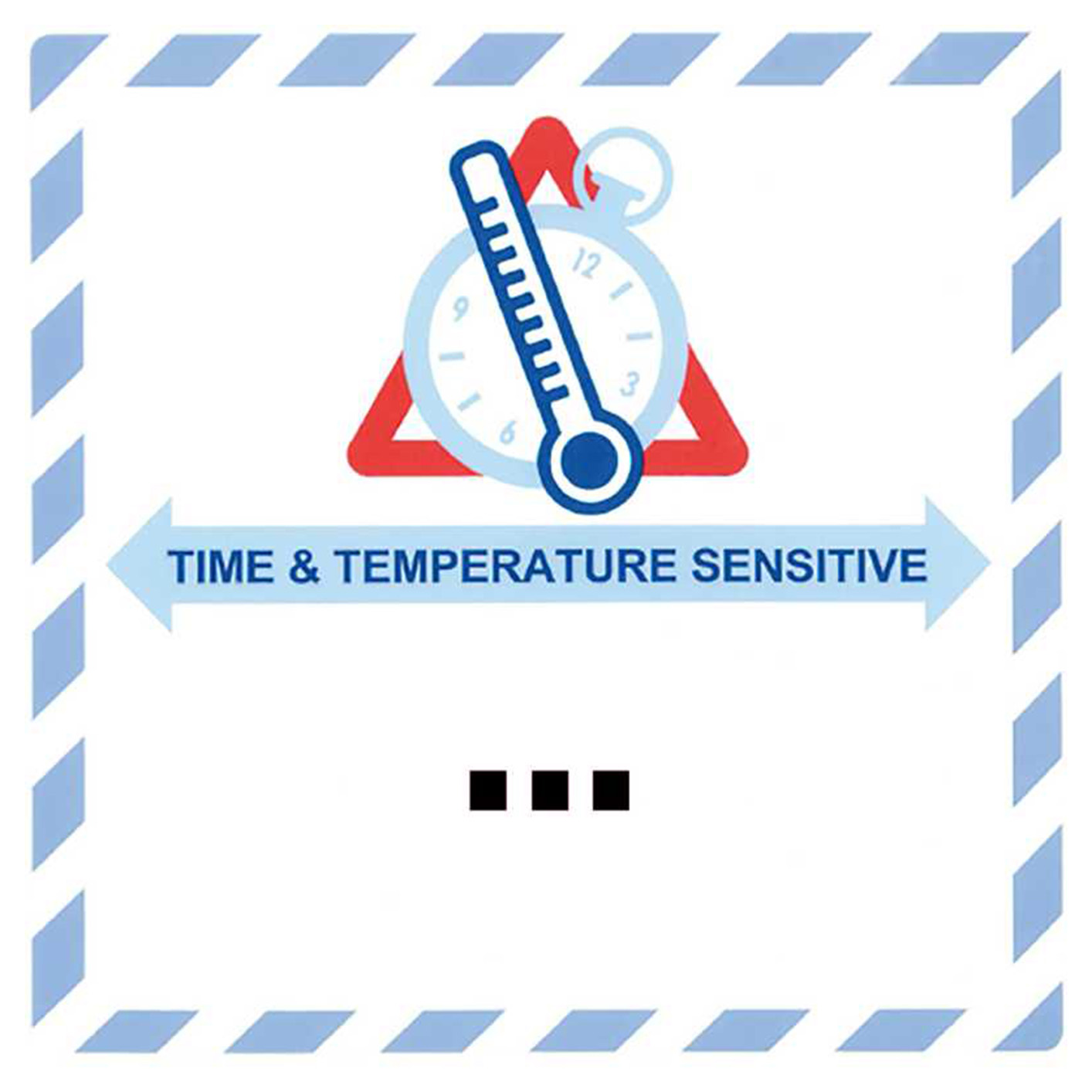 Als zentrales Erkennungsmerkmal zeigt das Kennzeichen die Symbole „Maßstab, Uhr und Warndreieck“, übereinander angeordnet. Ergänzt wird dies durch die Aufschrift „Time & Temperature Sensitive“, die von einem hellblauen Pfeil in beide Richtungen (links/rechts) eingerahmt wird. Zusätzlich sorgt ein gestreifter blauer Rahmen für hohe Sichtbarkeit und klare Abgrenzung auf der Verpackung.